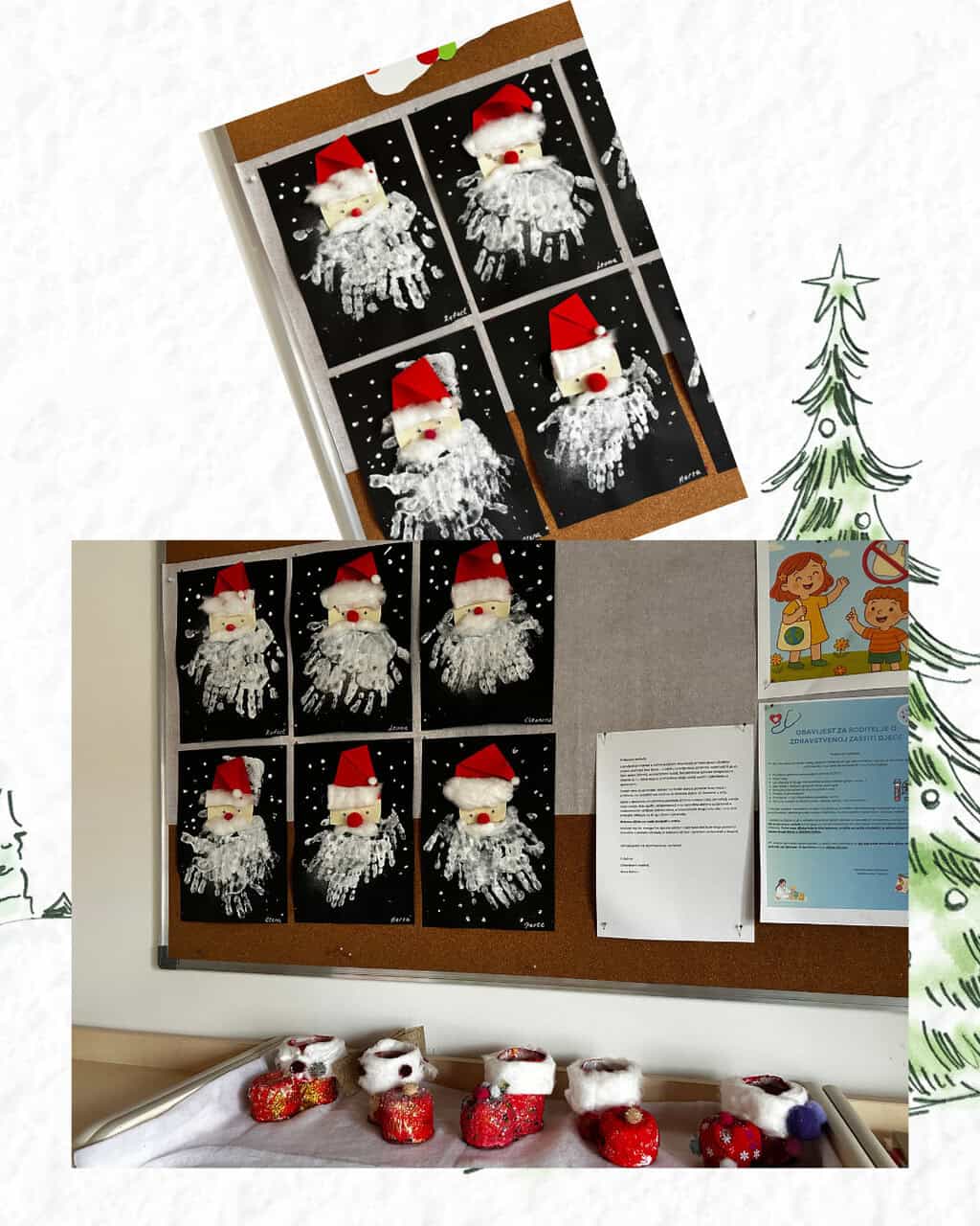 Izrađivali smo božićne čizmice, otiske ruku, motive Djeda Božićnjaka te istraživali različite materijale, boje i šljokice, potičući razvoj osjetila i kreativnog izražavanja. Aktivnosti su bile usmjerene na doživljaj i proces, uz slobodno istraživanje i igru.
