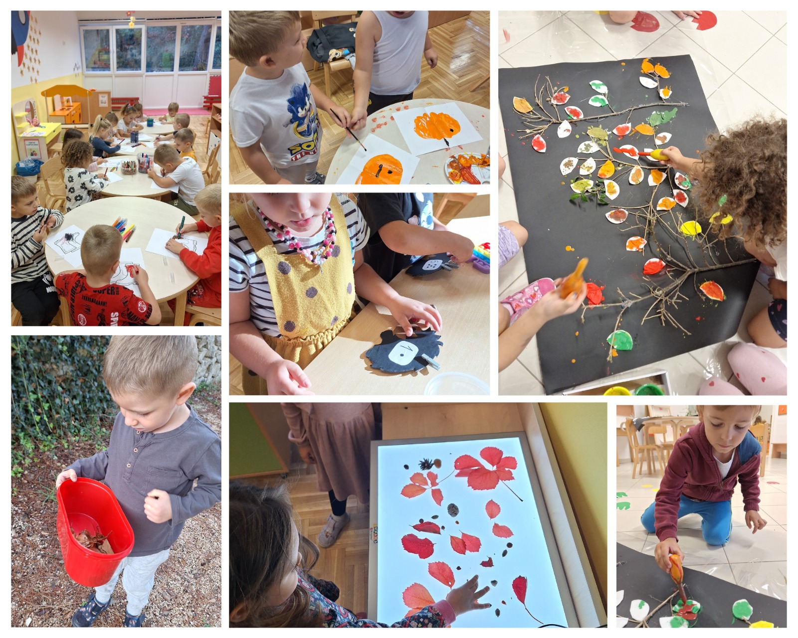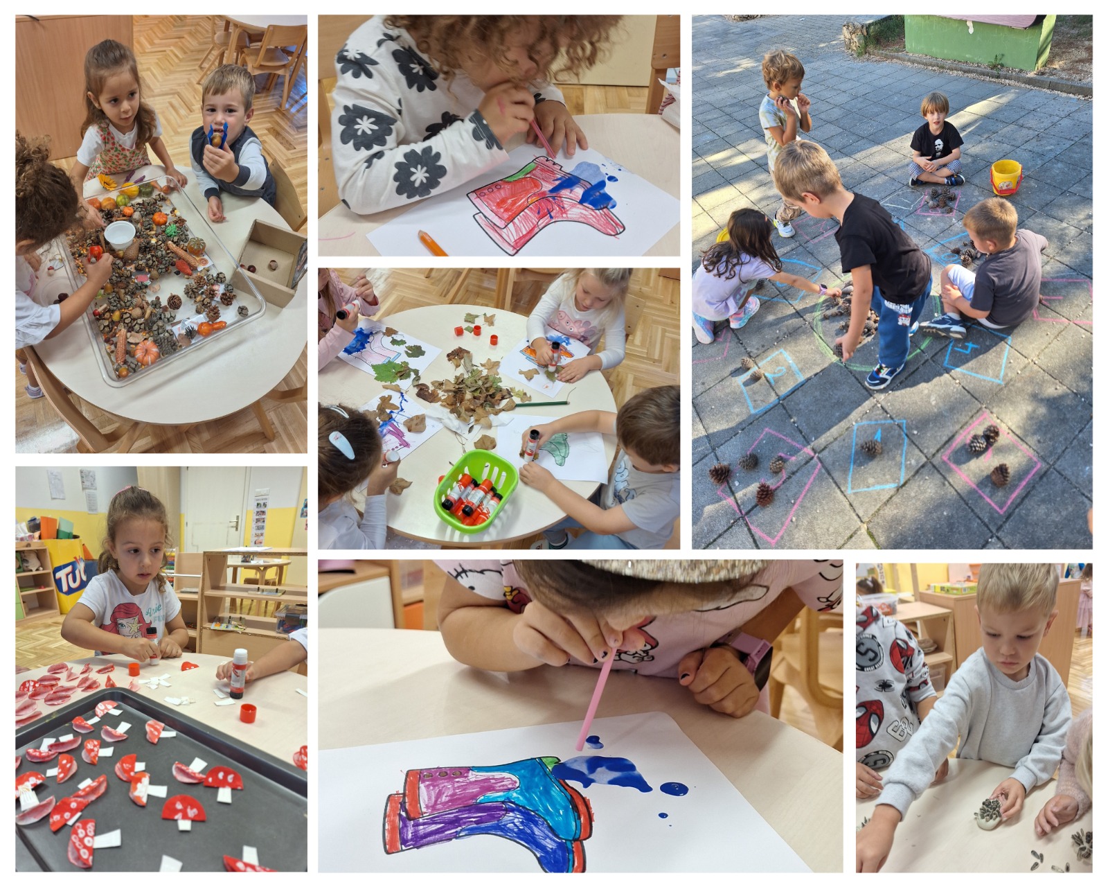 Češeri su nam poslužili za razvijanje predmatematičkih kompetencija, a kroz igru i kreativne aktivnosti stvarali smo i jesensku posudu iznenađenja. Igrokazi sa šumskim životinjama pomagali su nam u razvoju mašte, govora i vokabulara, dok smo o gljivi muhari učili kroz pjesmicu i likovne aktivnosti.