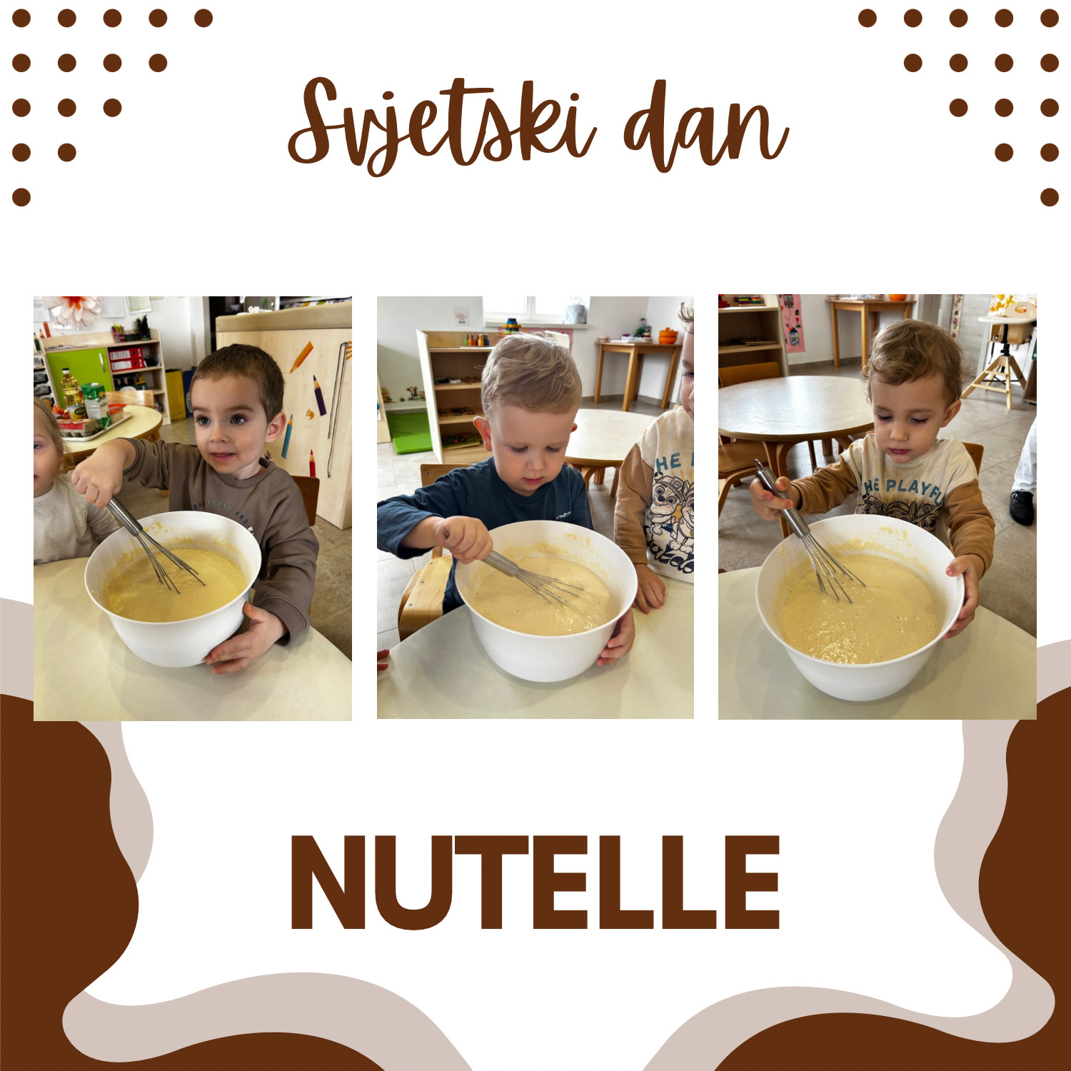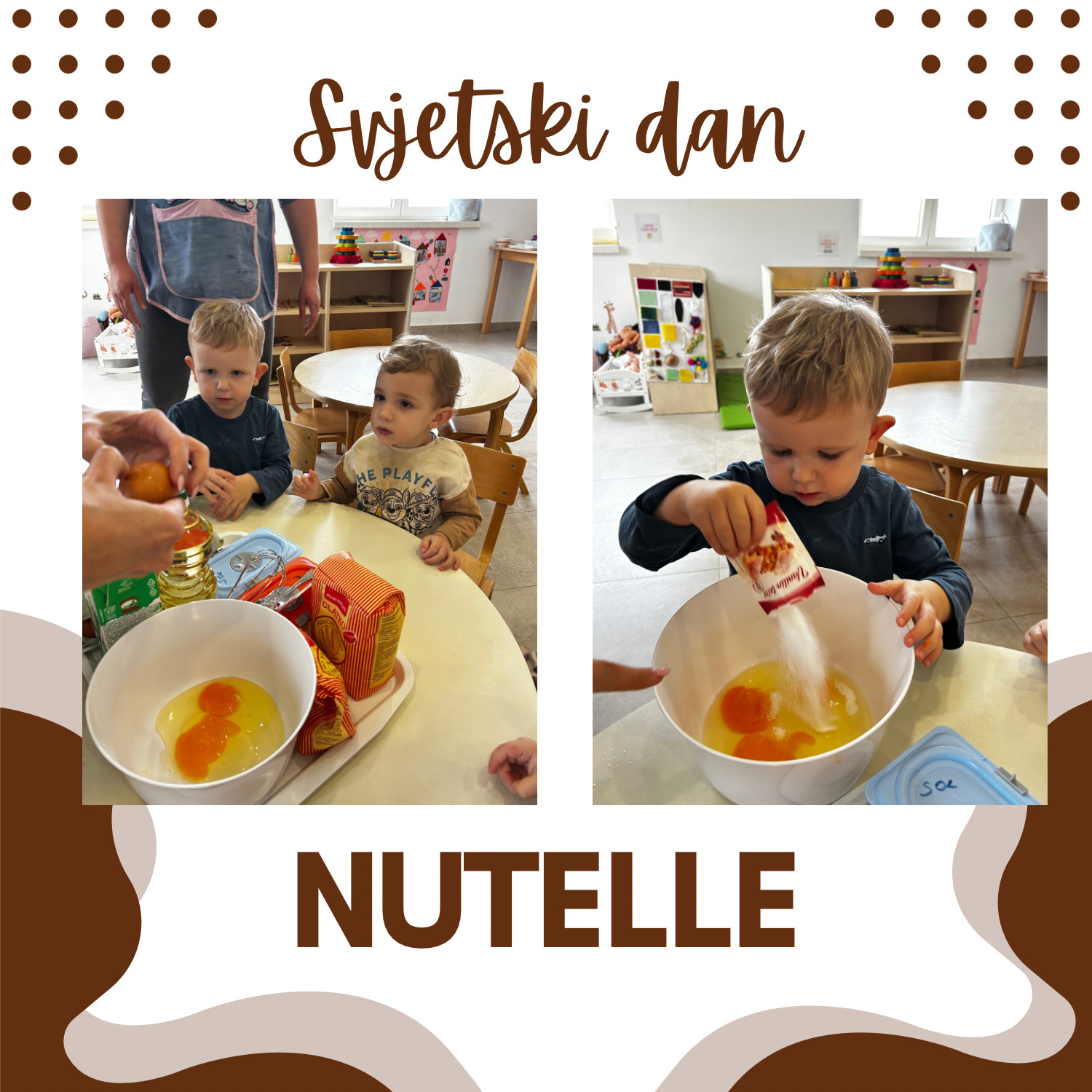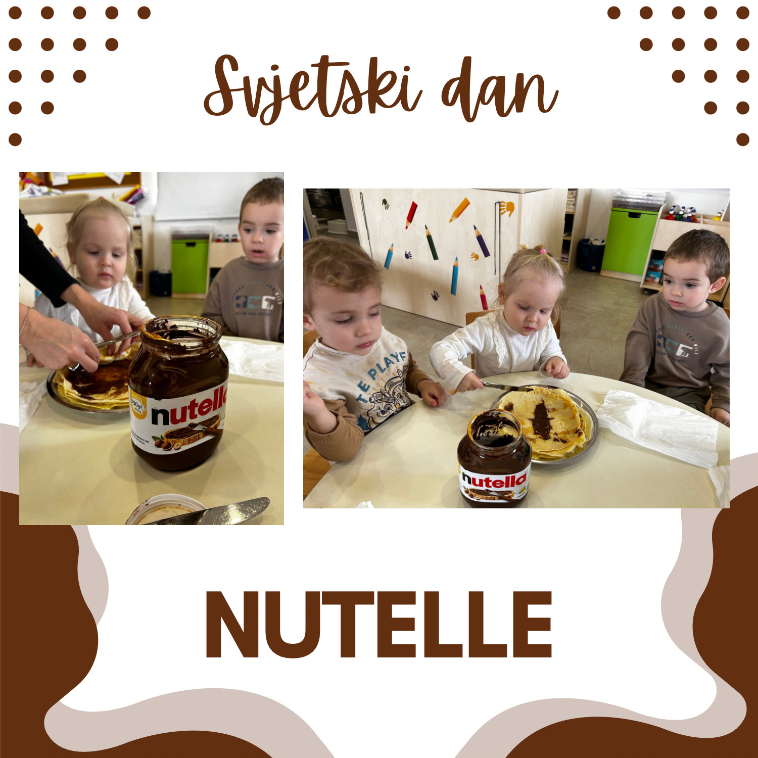 U našem vrtiću obilježili smo Svjetski dan Nutelle na poseban i ukusan način. Zajedno s našom kuharicom pripremali smo palačinke, učili o namirnicama i sudjelovali u njihovoj izradi. Na kraju smo ih namazali Nutellom i, naravno, s veseljem i malo pojeli. Aktivnost je protekla u ugodnoj i veseloj atmosferi, uz puno smijeha i slatkih trenutaka.
