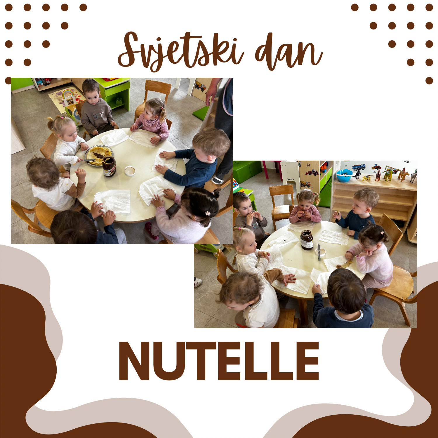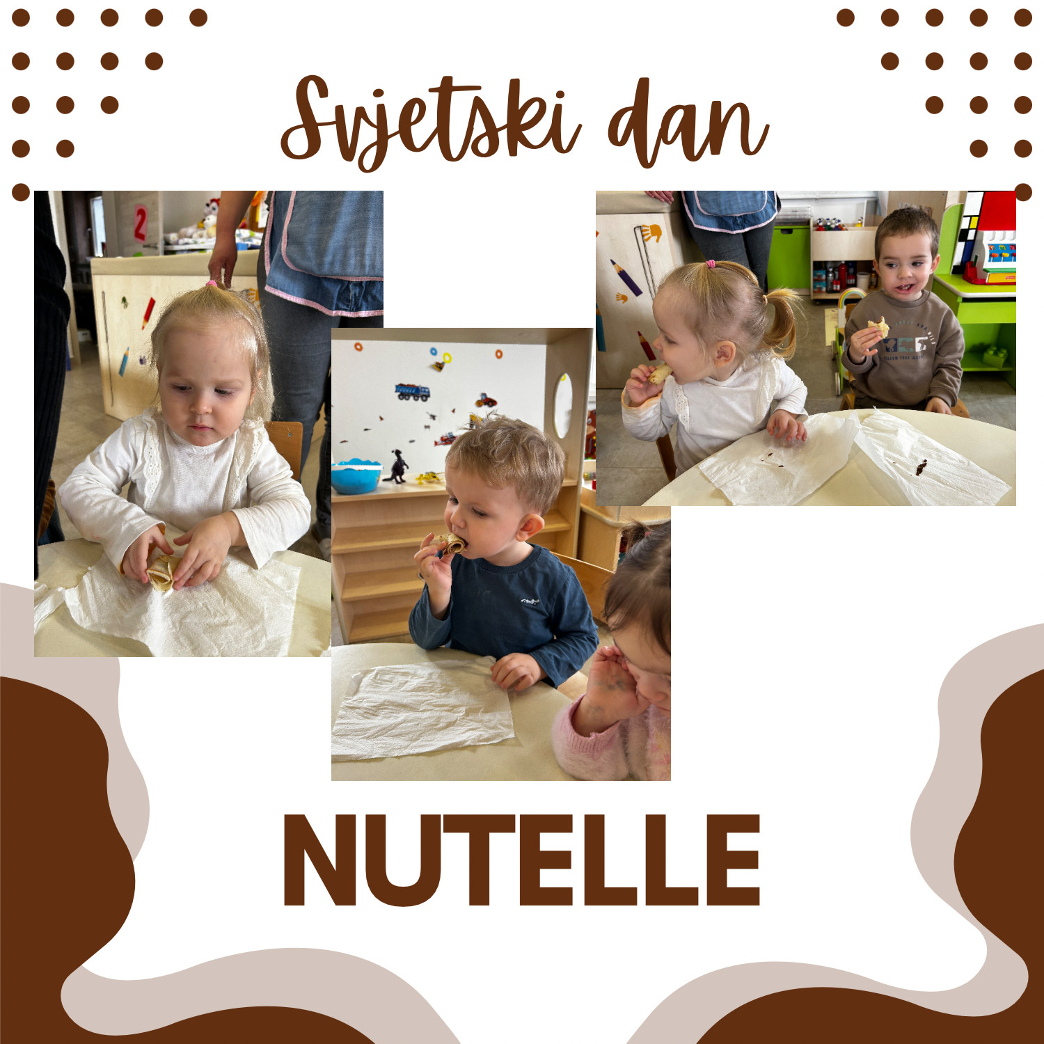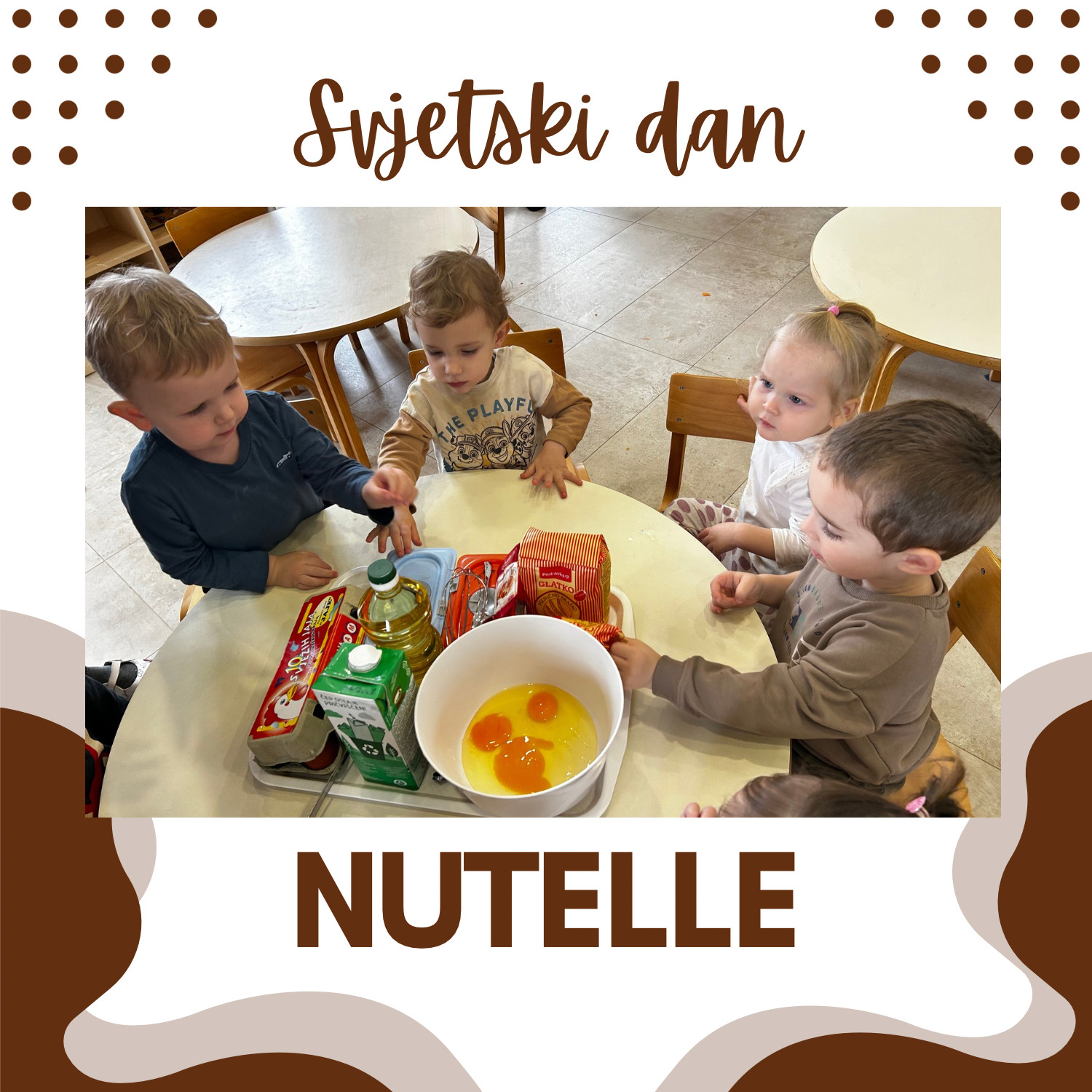 U našem vrtiću obilježili smo Svjetski dan Nutelle na poseban i ukusan način. Zajedno s našom kuharicom pripremali smo palačinke, učili o namirnicama i sudjelovali u njihovoj izradi. Na kraju smo ih namazali Nutellom i, naravno, s veseljem i malo pojeli. Aktivnost je protekla u ugodnoj i veseloj atmosferi, uz puno smijeha i slatkih trenutaka.