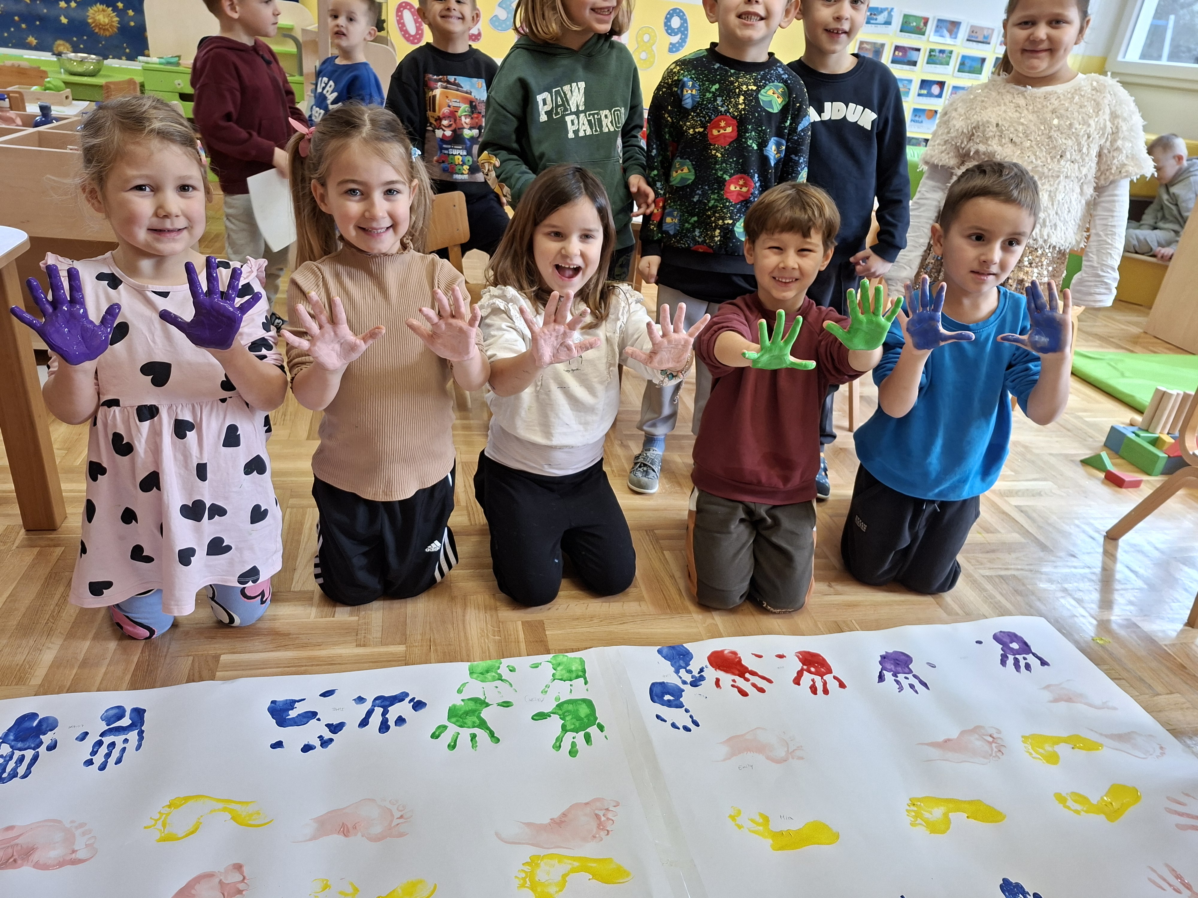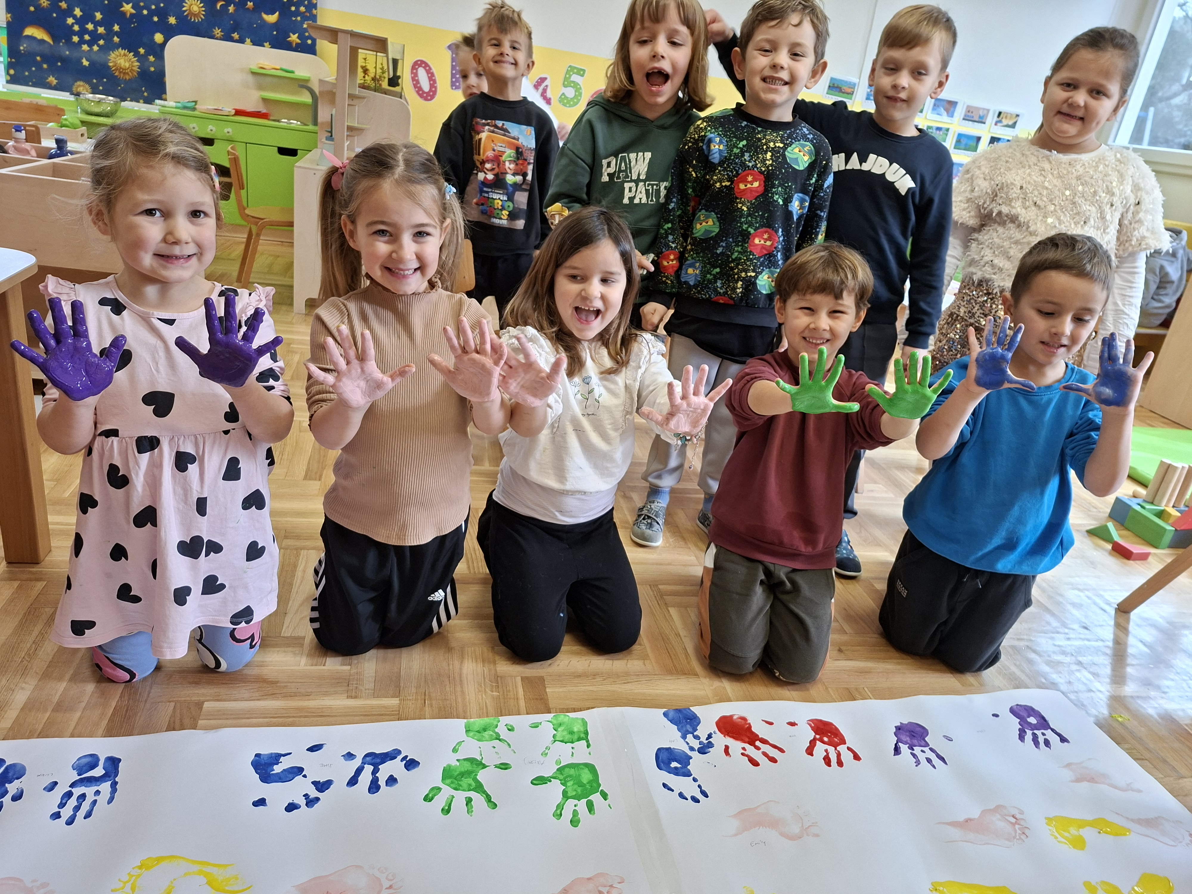 Knjiga koju smo odabrali za siječanj je “Ideja od milijuuuuun dolara.💵 Nakon što smo je pročitali i djeca su je prepričavala, odlučili su da i oni žele ostavljati otiske kao i ”one pametne patke, pa možda i naše netko želi kupiti”. Stoga smo po želji rukama ili stopalima ostavljali svoje otiske na velikom papiru i stavili na prodaju. 🐾 ⭐️