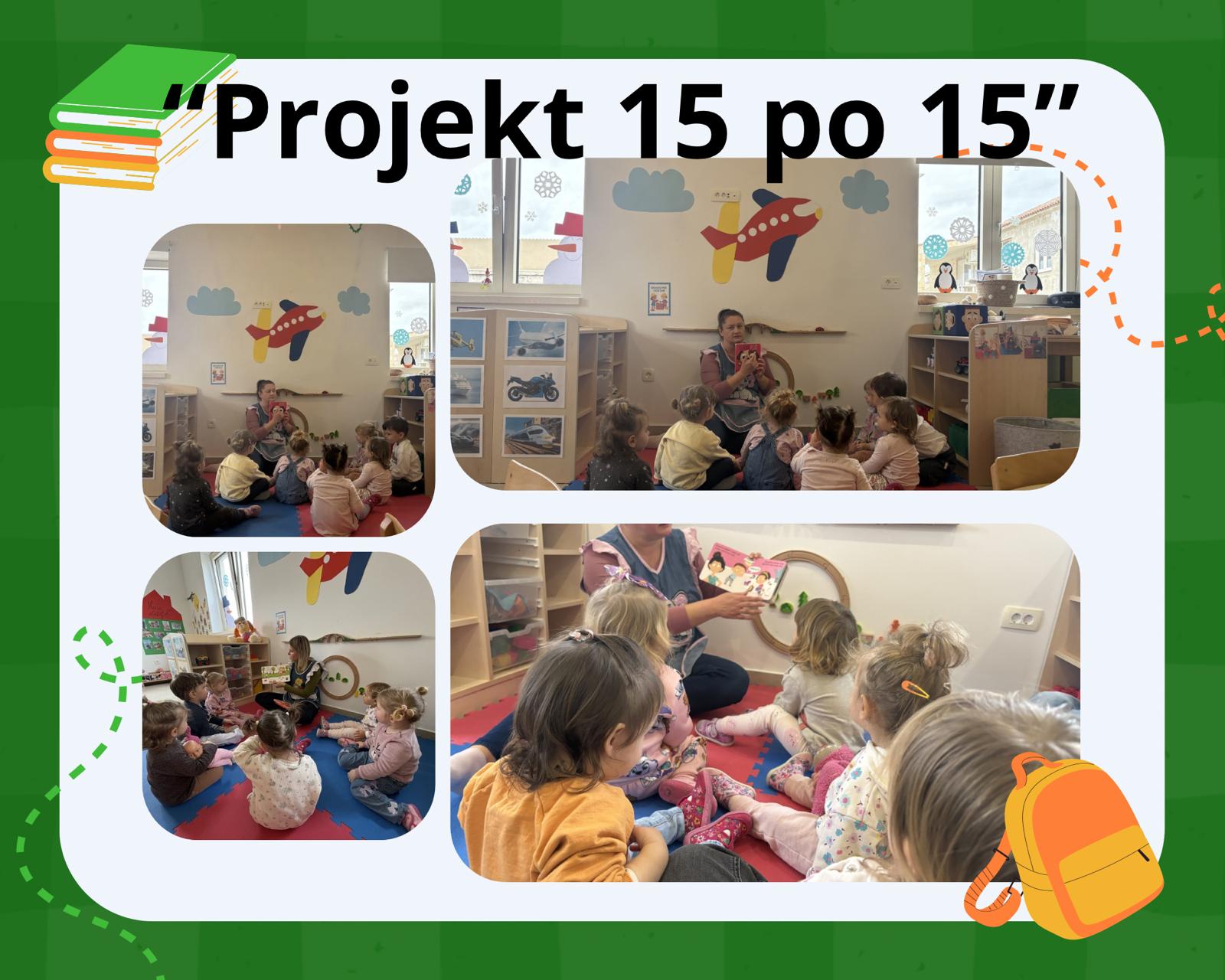 Tijekom projekta „15 po 15“ svakodnevno smo čitali slikovnice razne tematike. Djeca su aktivno slušala, sudjelovala u razgovoru i dramatizaciji priča te usvajala nove riječi i pojmove kroz interaktivno čitanje.